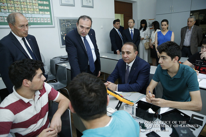 Prime Minister Hovik Abrahamyan visited today the special physics-mathematics school after Artashes Shahinyan at the Yerevan State University. Accompanied by school director Haykaz Navasardian, the Premier walked round the school getting acquainted with the conditions available for study, current and future programs. Hovik Abrahamyan visited the physics and chemistry laboratories, computer classes, talked to the students, saw the robotic devices manufactured by them, physical and chemical... more »