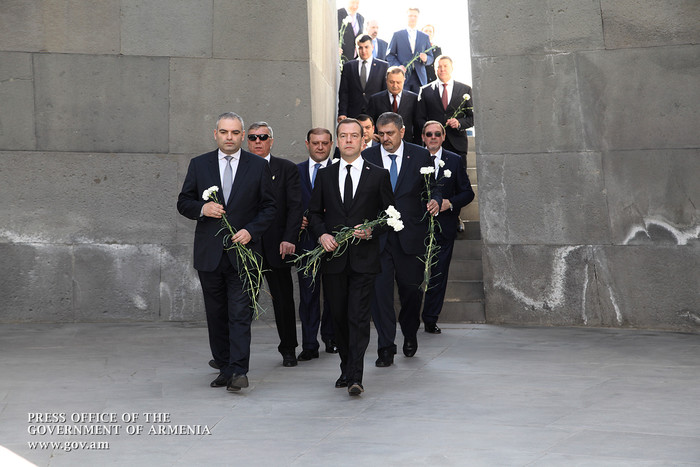Prior to holding official meetings and negotiations at the Government of the Republic of Armenia as part of his official visit to Armenia, Russian Premier Dmitry Medvedev visited Tsitsernakaberd Memorial Complex to lay a wreath at the Armenian Genocide Memorial.